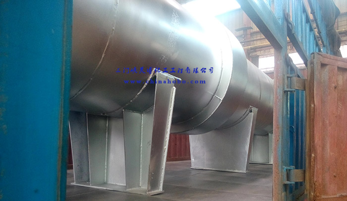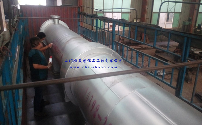 操作人員在換熱器設備上打上三門峽昊博化工工程有限公司標示和電話0398-2918156